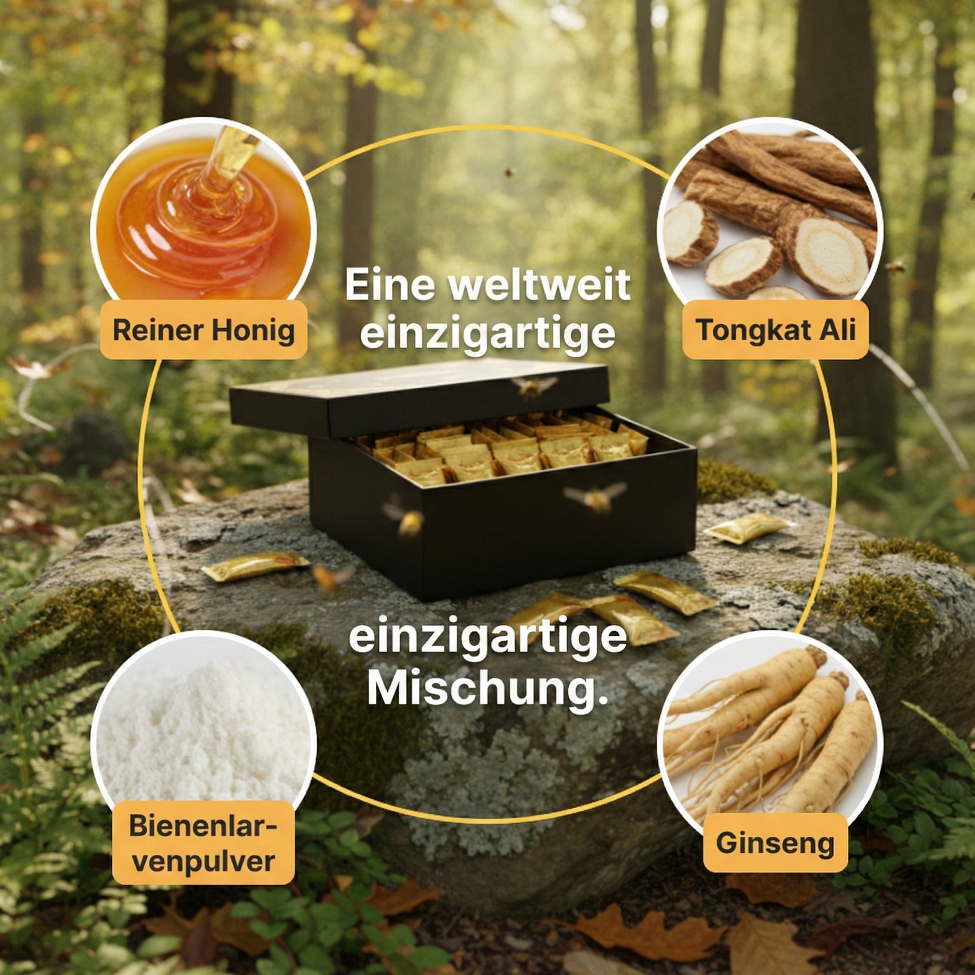Die Honigmatrix liefert sauberen Antrieb, der Ginseng erhält geistige Klarheit: Vitalität vom Anfang bis zum großen Finale.