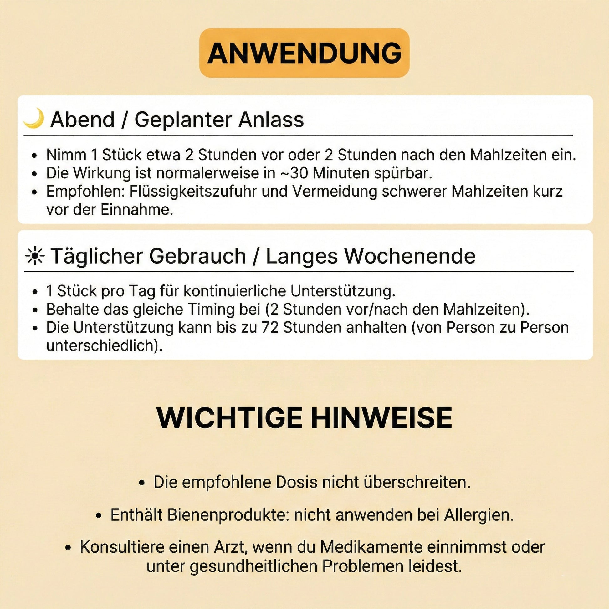 Typischer Wirkungseintritt ~30 Minuten, Unterstützung die bis zu 72 Stunden anhalten kann: bereit für den Abend, geladen auch fürs Wochenende.
